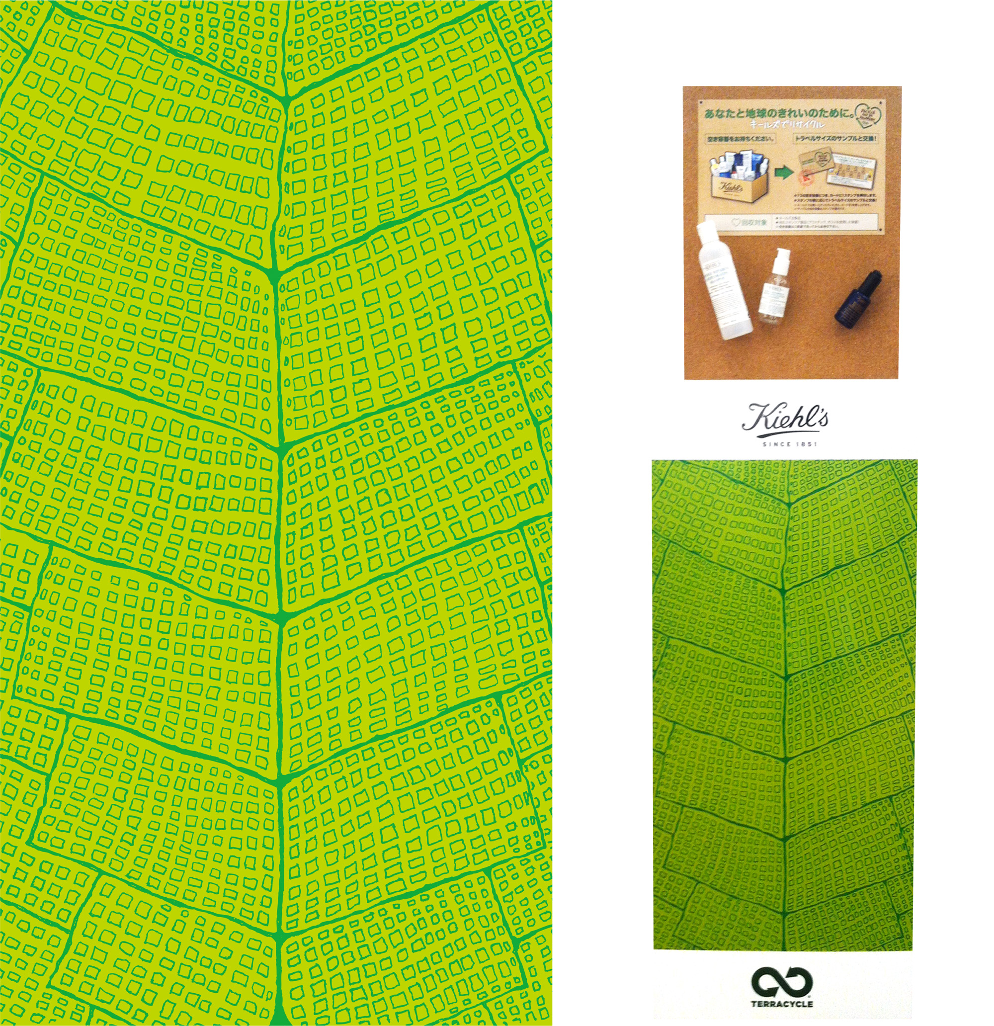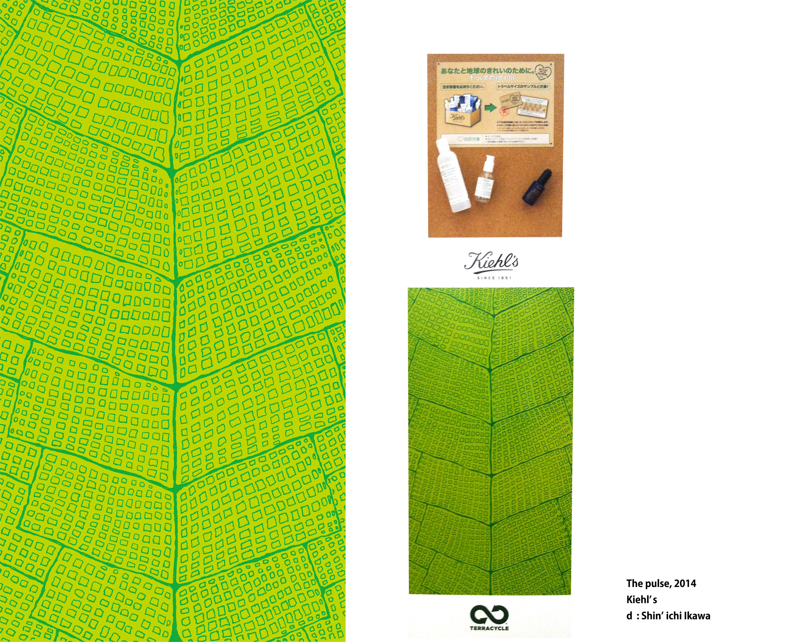 NYのスキンケアブランドKiehl’sのためのリサイクルボックスデザイン。「Nature in the city」というテーマのもと「脈」というコンセプトを立ち上げデザイン。葉の葉脈もしくはビルが立ち並んでいるように見える様子は、生命にあふれる植物が息づくように街も同じように呼吸している様子と呼応している。リサイクルという方法で自然や街並の「脈」となることを目指した。